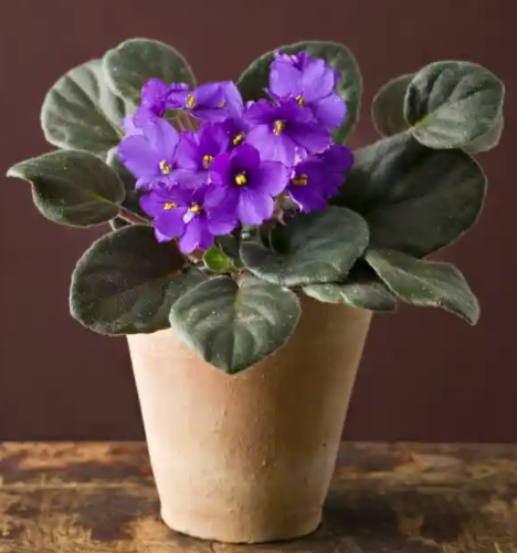 African violets are more dependent on regular care than most other house plants. They “sulk” quite obviously when they are dry or cold. The plants flower best in bright light, but not in extreme heat and humidity. They bloom well in east or west windows or under fluorescent lights. The preferred daytime temperature is 72 degrees F. Night temperatures should not fall below 62 degrees F.