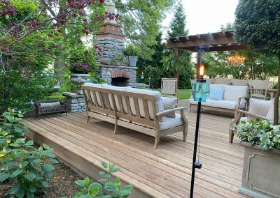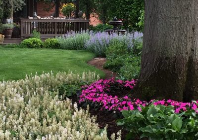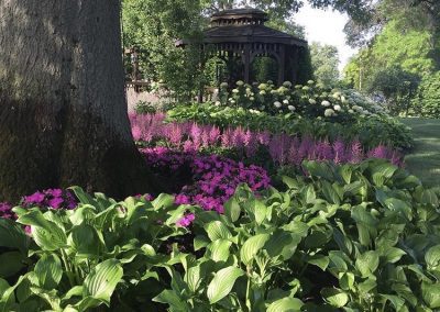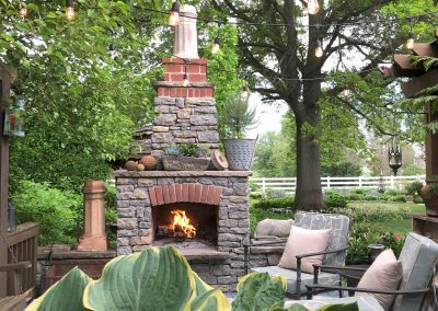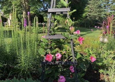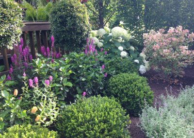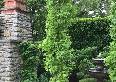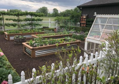 The primary focus of this landscape design is to allow the plain, modern ranch house to disappear, and become a part of the background with the lush plantings becoming the primary focus of the property. Situated on ¾ acres of land in the middle of farming country, this property has been transformed in phases, from a neat little ranch home to a planned English garden. The first task was to disguise the brick veneer for some good old world charm. We planted Boston ivy with the intention of keeping it well maintained, allowing the hard exterior of the home to become a soft and subtile backdrop for the planned garden spaces of boxwood hedges, stone walls and lovely perennials, all in keeping with an English Garden. The gardens were designed to allow expansions over the years including an outdoor stone fireplace and a wonderful kitchen garden with raised beds and espalier fruit trees.