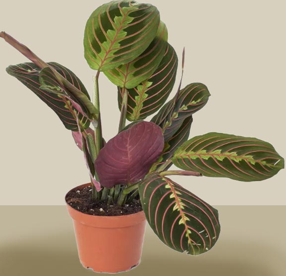 Calathea is a beautiful houseplant with mottled or striped leaves in a variety of patterns. Bright indirect light is excellent, but lower light will be tolerated. Very low light will not be.