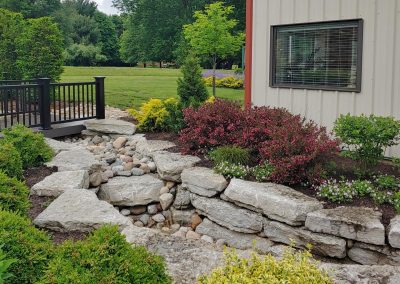 Our first goal was to heavily screen the traffic and sound from the busy road. We built a series of stone walls with terraces to create privacy and allow for interesting planting arrangements. This configuration demonstrates how a tall wall doesn’t have to feel imposing. Its curving form and “planting pocket” terraces allow focal-point plants to be showcased, while adjacent plantings add seasonal interest through color and textural variation.