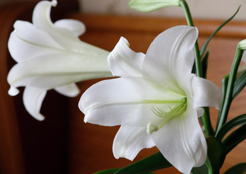 Indoors, Easter Lilies prefer to be in a spot with good bright light but not direct hot sun. The soil should be kept moist and the temperature, particularly at night, should be kept cool. If you allow the soil to dry out or the temperatures to get too high, the flowers won’t last as long as normal. The number of flower buds present when the plant is purchased determines lasting time in the home. Another thing that can be done to prolong the life of blooms is removal of the yellow tips (anthers) from the six stamens as soon as possible after the flower opens.