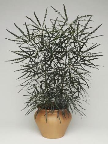 As its species name implies, this is another very elegant form of aralia. The five-fingered leaflets of this plant are very narrow and slightly serrated. When the new foliage first emerges, the leaves are glossy and almost copper colored. As the leaves mature, they darken until they are almost black.