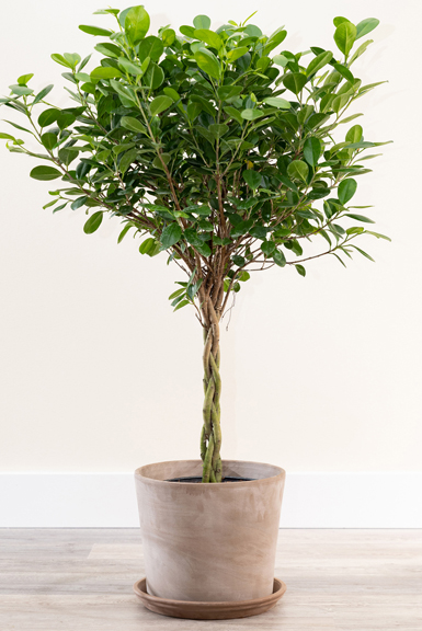 The Ficus, or Weeping Fig, has graceful weeping branches and thick, shiny dark green foliage that form a dense treetop above the smooth grey bark. There are many varieties available, some with bright green leaves, some with dark bluish-green leaves. They come with straight natural trunks, braided or spiraled. You will find them in bush and tree form. They make wonderful bonsai!