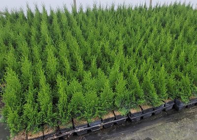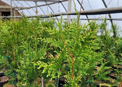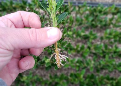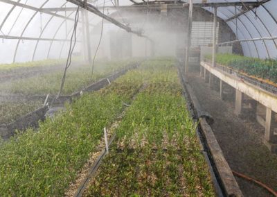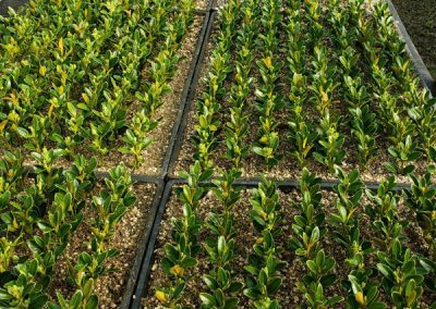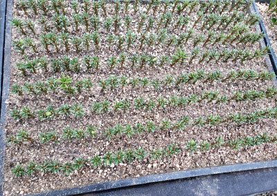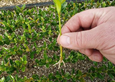 In order to maintain a constant supply of evergreens, we begin a process called plant propagation every winter. In mid-December, we take small cuttings off of existing boxwoods, arborvitae, and taxus and stick them in a media mixture of 50% Perlite and 50% sand (Pic1). Trays are placed on heated benches under an automated misting system (Pic2). Ambient air is maintained between 45-50 degrees while the media rootzone is kept between 65-70 degrees in order to promote root growth but limit energy to top growth (Pic 3-4). We also extend daylight with artificial lighting. Once the cuttings have developed a strong root system, they will be removed from media mixture, root pruned, and potted up into 3-4” containers in April-May (Pic 5-6) where the cuttings will continue growing until Spring of 2025. (Pic 7-8) Then they will be lined out in the fields or shifted up in container size to continue growing. The time from cutting to harvestable size in the field can take anywhere from 3-8 years depending on plant variety and growth habit. Through hard wood plant propagation of roughly 20,000 plants at any time, we are able to ensure a continual stream of quality, locally grown trees and shrubs for decades to come.