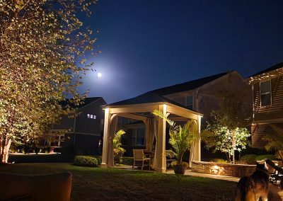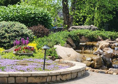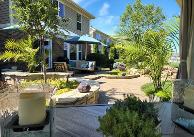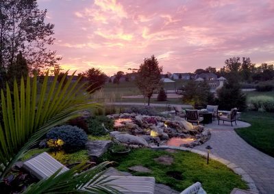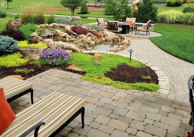 The owners wanted to create a resort like outdoor space in the backyard. The actual yard is quite small at 65’x 67’ but appears much larger through the placement of key plants to block off site elements while taking advantage of borrowed scenery from a large common space adjacent to the home. This was achieved by creating 3 distinct outdoor rooms each utilizing the slope of the yard to create a dramatic but simple ensemble. All vantage points of the yard focus on a three-tiered water feature. The first space closest to the home is a 20’ x12’ patio with outdoor dining, a bar and grilling area. This steps down to a curvilinear walk leading to a12’x12’ pavilion with a sitting area. It also leads on the opposite of the yard to a 15 ft. Diameter patio with a gas fire pit . The upper spaces are connected by a natural Lannon Stone wall as is the sitting wall around the fire pit area, tying the materials to the weathered limestone used in the water feature.