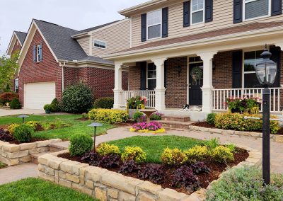 Our client bought this Fischer Spec. Home in 2012 wanting to have the landscape compliment the American Four-Square architecture. We used the grade change in the yard to implement a 15” semi dry stacked stone accent wall to create a courtyard leading into the front porch. A simple paver was used to walk was used to create a two-entry point walkway. A concrete bird bath, black aluminum planters and wrought iron urns are used to enhance the period architecture. Simple the plantings were simple hedges with flowering shrubs and perennials to provide seasonal color. Nepeta, spriraea, Pyramidal boxwood, May Nights Salvia and Caramel Coral Bell create a beautiful year-round display enhanced with seasonal displays in the urns making this transformation complete.